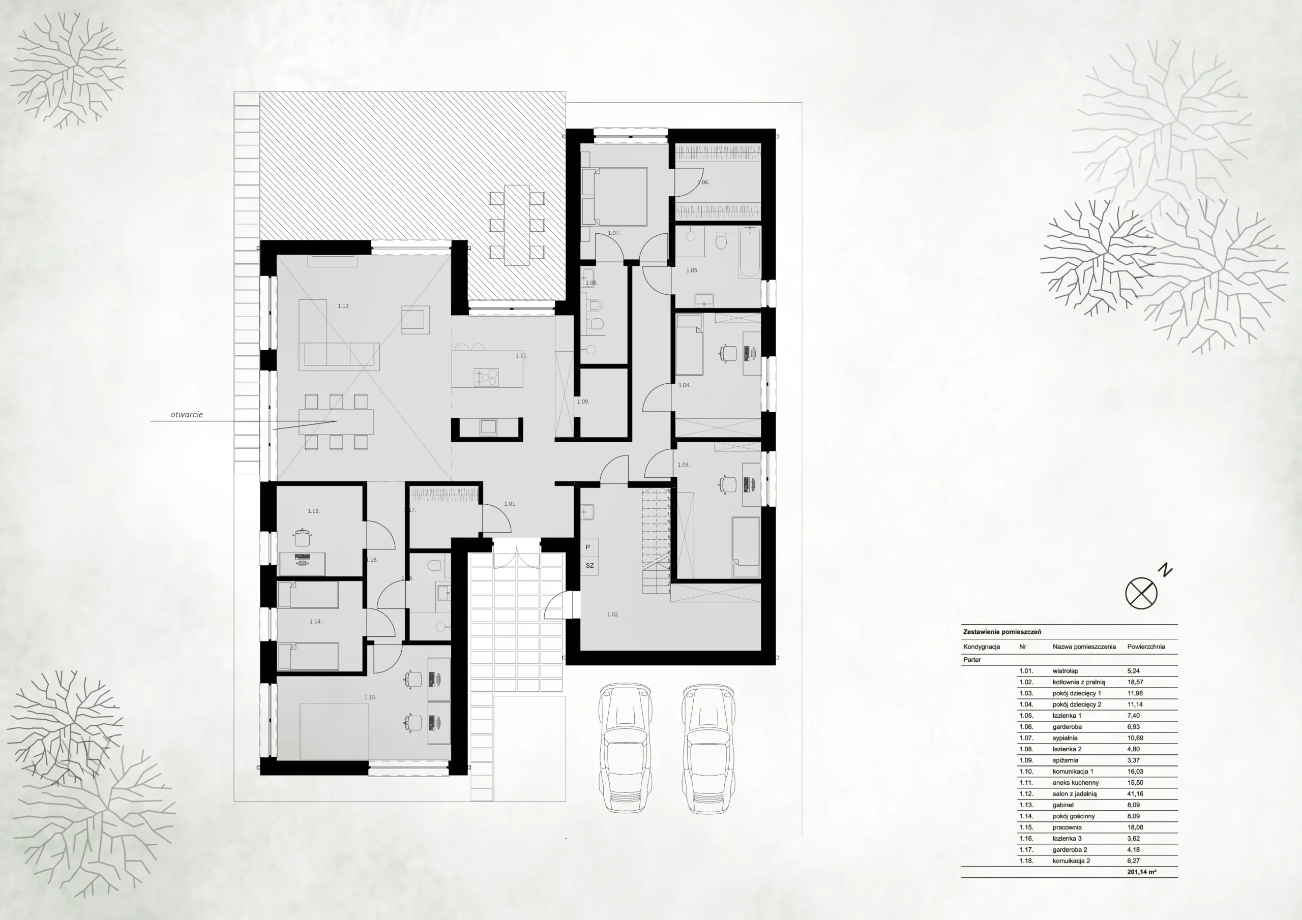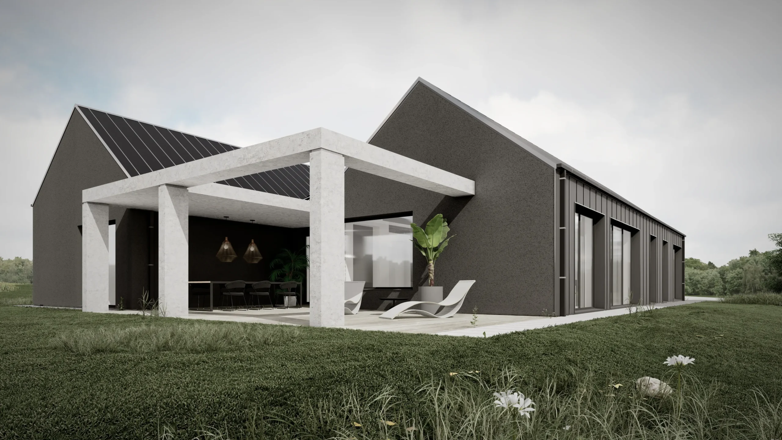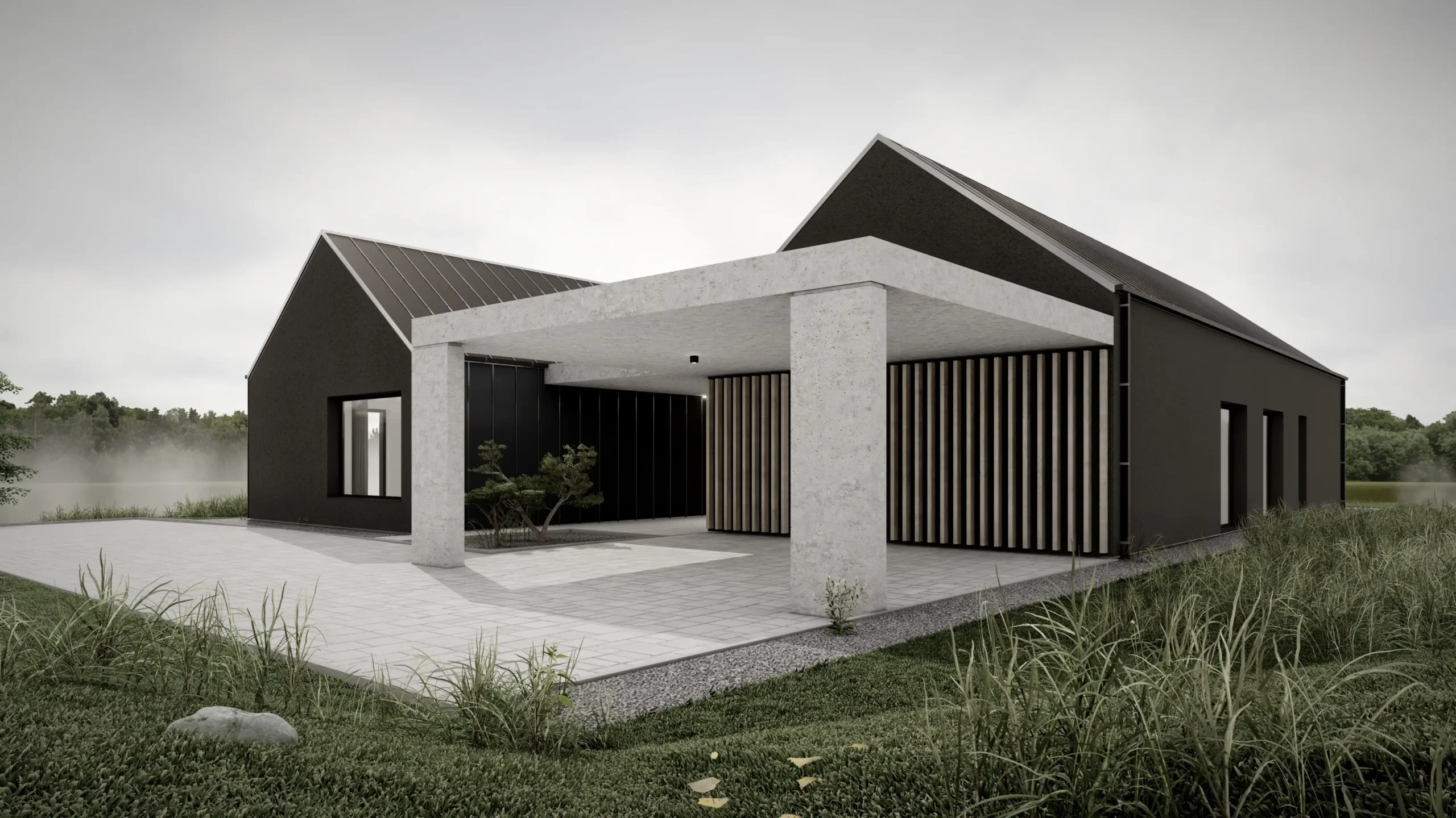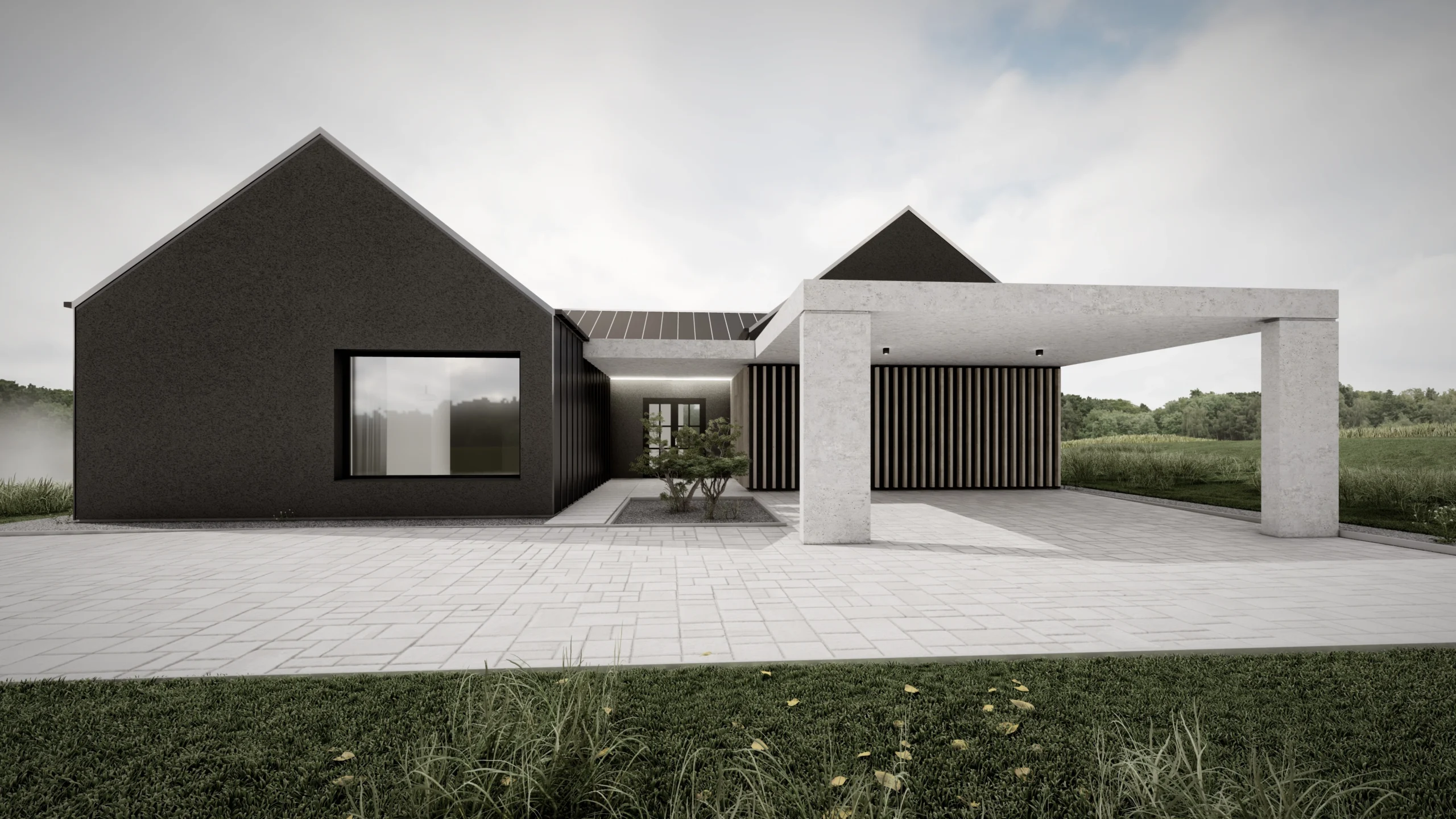 Prezentowany projekt to elegancki dom parterowy, który łączy wyrazistą, nowoczesną formę z przemyślaną funkcjonalnością. Prosta bryła, kontrastowa kolorystyka i starannie zaprojektowane przeszklenia tworzą przestrzeń otwartą na otoczenie, zapewniając równowagę między prywatnością a bliskością natury.